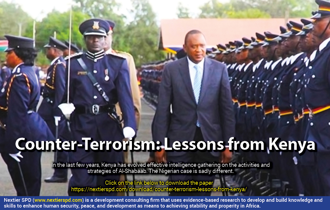 Policy Weekly Counter-Terrorism: Lessons from Kenya by nextierspd January 20, 2020 written by nextierspd January 20, 2020 134 On January 15, 2019, five Al-Shabaab terrorists invaded the upscale Dusit Hotel in Nairobi. They bombed several vehicles at the car park before entering the lobby where one of the terrorists blew himself up, leaving 21 persons dead and 28 injured. Like Nigeria’s Boko Haram, Al-Shabaab violently agitates for the implementation of radical Islamic laws in secular states (Agbiboa, 2014). Even though the two terrorist groups share ideological and operational commonalities, yet state responses to them are markedly dissimilar. This edition of Nextier SPD Weekly examines the approaches of both countries. Click here to download report. 0 comment 0 FacebookTwitterPinterestEmail nextierspd previous post War on Terror and Public Right to Know next post Fake News: The Digital Wildfires You may also like Youth Bulge, Governance and Security in Post-conflict Sierra... July 3, 2024 No Face, No Case: The Realities of Gender-sensitive... June 28, 2024 Strengthening Humanitarian Response in Post-Conflict Communities in Nigeria:... June 21, 2024 Crude Oil Theft and Illegal Refining in Nigeria:... June 13, 2024 Crude Oil Theft and Illegal Refining in Nigeria:... June 5, 2024 Navigating Autonomy in Nigeria’s LGAs: Challenges and Opportunities May 31, 2024 Rethinking Youth Engagement in Peacebuilding May 24, 2024 Strengthening Enablers of Peace and Security in the... May 17, 2024 Towards a Paradigm Shift in Conflict Management in... May 7, 2024 Redefining Slum Dwellers: Insights into Nigeria’s Urban Challenges... April 24, 2024 Leave a Comment Cancel Reply Save my name, email, and website in this browser for the next time I comment.