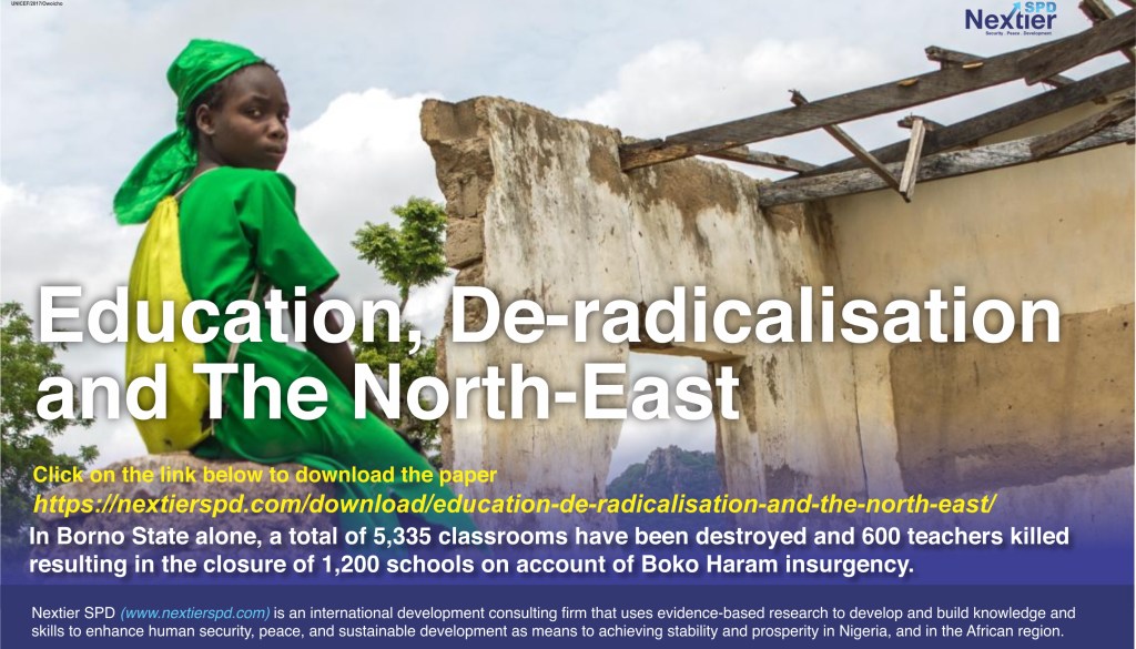 Policy Weekly Education, De-radicalisation and The North-East by nextierspd January 20, 2020 written by nextierspd January 20, 2020 132 The educational sector has been one of the most contested and conflicted spaces in Northern Nigeria since the colonial times. Thus, most Northern youth have been consistently denied access to modern education. Yet, the Madrassa education cherished in the region is hardly accepted as a basis for public sector employment. Consequently, the teeming youth have been confined to unprofitable menial jobs such as shoe-shinning, wood-hewing, water-fetching and solicitation of alms to meet their basic needs (Imobighe, 2012). On an account of these drawbacks, a number of them have been brain-washed, recruited and radicalised by insurgent groups such as Boko Haram and Islamic State West Africa Province which continue to denunciate modern education to date. Importantly, modern education is one of the chief cornerstones which can mediate sustainable development in the troubled region and obviate incessant recourse to violence. Following these developments, this edition of Nextier SPD Weekly examines the role of educational reform and de-radicalisation in the reconstruction agenda of the North-East. Click here to download report. 0 comment 0 FacebookTwitterPinterestEmail nextierspd previous post R2P, Stabilisation and The North-East next post Return and Resettlement You may also like Youth Bulge, Governance and Security in Post-conflict Sierra... July 3, 2024 No Face, No Case: The Realities of Gender-sensitive... June 28, 2024 Strengthening Humanitarian Response in Post-Conflict Communities in Nigeria:... June 21, 2024 Crude Oil Theft and Illegal Refining in Nigeria:... June 13, 2024 Crude Oil Theft and Illegal Refining in Nigeria:... June 5, 2024 Navigating Autonomy in Nigeria’s LGAs: Challenges and Opportunities May 31, 2024 Rethinking Youth Engagement in Peacebuilding May 24, 2024 Strengthening Enablers of Peace and Security in the... May 17, 2024 Towards a Paradigm Shift in Conflict Management in... May 7, 2024 Redefining Slum Dwellers: Insights into Nigeria’s Urban Challenges... April 24, 2024 Leave a Comment Cancel Reply Save my name, email, and website in this browser for the next time I comment.