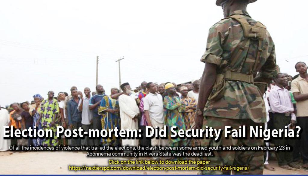Policy Weekly Election Post-mortem: Did Security Fail Nigeria? by nextierspd January 20, 2020 written by nextierspd January 20, 2020 131 On February 23, 2019, the Presidential and National Assembly elections were conducted in Nigeria. Though largely peaceful in most states, the polls were characterized by irregularities and violence in Rivers, Anambra, Lagos and a few other states. Of all the incidences of violence that trailed the elections, the clash between some armed youth and soldiers on February 23 in Abonnema community in Rivers State was the deadliest. In the mayhem, soldiers killed six youths and lost one officer while two others were injured. Following these developments, this edition of Nextier SPD Weekly assesses the rules of military engagement in an election and makes recommendations to avert soldiers-civilians clashes in the future. Click here to download report. 0 comment 0 FacebookTwitterPinterestEmail nextierspd previous post Nigeria: Ending the Land Wars next post Building Bridges Across Divides You may also like Youth Bulge, Governance and Security in Post-conflict Sierra... July 3, 2024 No Face, No Case: The Realities of Gender-sensitive... June 28, 2024 Strengthening Humanitarian Response in Post-Conflict Communities in Nigeria:... June 21, 2024 Crude Oil Theft and Illegal Refining in Nigeria:... June 13, 2024 Crude Oil Theft and Illegal Refining in Nigeria:... June 5, 2024 Navigating Autonomy in Nigeria’s LGAs: Challenges and Opportunities May 31, 2024 Rethinking Youth Engagement in Peacebuilding May 24, 2024 Strengthening Enablers of Peace and Security in the... May 17, 2024 Towards a Paradigm Shift in Conflict Management in... May 7, 2024 Redefining Slum Dwellers: Insights into Nigeria’s Urban Challenges... April 24, 2024 Leave a Comment Cancel Reply Save my name, email, and website in this browser for the next time I comment.
