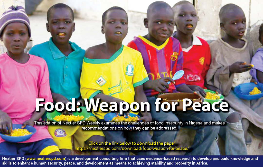 Policy Weekly Food: Weapon for Peace by nextierspd January 20, 2020 written by nextierspd January 20, 2020 139 Food and nutrition are key components of any post-conflict reconstruction. This is the position of all the leading institutions and thinkers in the space. Organisations such as Food and Agriculture Organization (FAO), Oxfam International and several other aid organisations stress the need for food security in conflict recovery, community reintegration and sustainable peacebuilding programming in fragile states. Therefore, if the level of food insecurity in North-East Nigeria is not effectively managed, it may undermine stability and economic growth of the region and Nigeria as a whole. This edition of Nextier SPD Weekly examines the challenges of food insecurity in Nigeria and makes recommendations on how they can be addressed. … Click here to download report. 0 comment 0 FacebookTwitterPinterestEmail nextierspd previous post Governing Ungoverned Spaces next post Politics and the Thugs of War You may also like Youth Bulge, Governance and Security in Post-conflict Sierra... July 3, 2024 No Face, No Case: The Realities of Gender-sensitive... June 28, 2024 Strengthening Humanitarian Response in Post-Conflict Communities in Nigeria:... June 21, 2024 Crude Oil Theft and Illegal Refining in Nigeria:... June 13, 2024 Crude Oil Theft and Illegal Refining in Nigeria:... June 5, 2024 Navigating Autonomy in Nigeria’s LGAs: Challenges and Opportunities May 31, 2024 Rethinking Youth Engagement in Peacebuilding May 24, 2024 Strengthening Enablers of Peace and Security in the... May 17, 2024 Towards a Paradigm Shift in Conflict Management in... May 7, 2024 Redefining Slum Dwellers: Insights into Nigeria’s Urban Challenges... April 24, 2024 Leave a Comment Cancel Reply Save my name, email, and website in this browser for the next time I comment.