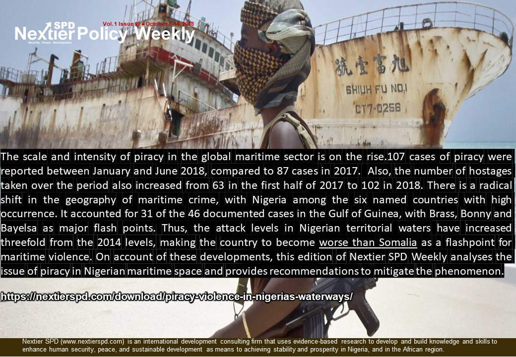 Policy Weekly Piracy: Violence in Nigeria’s Waterways by nextierspd January 5, 2020 written by nextierspd January 5, 2020 141 The scale and intensity of piracy in the global maritime sector is on the rise.107 cases of piracy were reported between January and June 2018, compared to 87 cases in 2017. Also, the number of hostages taken over the period also increased from 63 in the first half of 2017 to 102 in 2018. There is a radical shift in the geography of maritime crime, with Nigeria among the six named countries with high occurrence. It accounted for 31 of the 46 documented cases in the Gulf of Guinea, with Brass, Bonny and Bayelsa as major flashpoints. Thus, the attack levels in Nigerian territorial waters have increased threefold from the 2014 levels, making the country to become worse than Somalia as a flashpoint for maritime violence. On account of these Click here to download report. 0 comment 0 FacebookTwitterPinterestEmail nextierspd previous post Floods: Nigeria Submerged next post Democratising Violence You may also like Youth Bulge, Governance and Security in Post-conflict Sierra... July 3, 2024 No Face, No Case: The Realities of Gender-sensitive... June 28, 2024 Strengthening Humanitarian Response in Post-Conflict Communities in Nigeria:... June 21, 2024 Crude Oil Theft and Illegal Refining in Nigeria:... June 13, 2024 Crude Oil Theft and Illegal Refining in Nigeria:... June 5, 2024 Navigating Autonomy in Nigeria’s LGAs: Challenges and Opportunities May 31, 2024 Rethinking Youth Engagement in Peacebuilding May 24, 2024 Strengthening Enablers of Peace and Security in the... May 17, 2024 Towards a Paradigm Shift in Conflict Management in... May 7, 2024 Redefining Slum Dwellers: Insights into Nigeria’s Urban Challenges... April 24, 2024 Leave a Comment Cancel Reply Save my name, email, and website in this browser for the next time I comment.