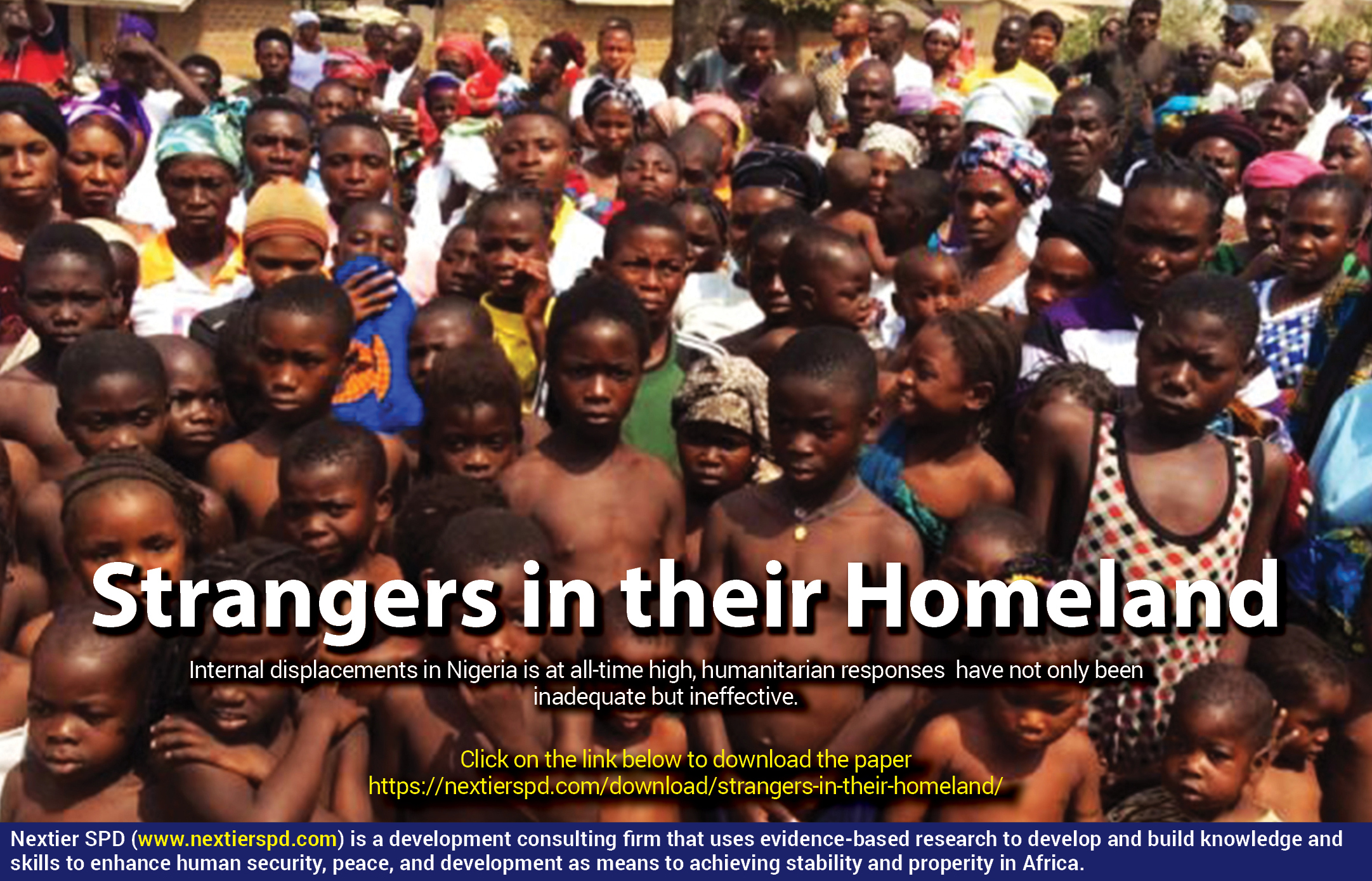 Policy Weekly Strangers in their Homeland by nextierspd January 20, 2020 written by nextierspd January 20, 2020 139 The level, scale and frequency of internal displacement in Nigeria have surged since 2010 on account of both human and natural disasters. According to the Internal Displacement Monitoring Centre, Nigeria is number eight on the list of countries with the highest number of displaced persons by the end of 2017; even worse than Afghanistan that has been in conflict for over four decades. Ironically, humanitarian responses have not only been inadequate and ineffective but have also, in some cases, resulted in worsening the predicament of the displaced. On account of these developments, this edition of Nextier SPD Weekly analyses the phenomenon of internal displacement and provides recommendations to reverse the trend. … Click here to download report. 0 comment 0 FacebookTwitterPinterestEmail nextierspd previous post Vigilante Groups: Protectors or Predators? next post Governing Ungoverned Spaces You may also like Youth Bulge, Governance and Security in Post-conflict Sierra... July 3, 2024 No Face, No Case: The Realities of Gender-sensitive... June 28, 2024 Strengthening Humanitarian Response in Post-Conflict Communities in Nigeria:... June 21, 2024 Crude Oil Theft and Illegal Refining in Nigeria:... June 13, 2024 Crude Oil Theft and Illegal Refining in Nigeria:... June 5, 2024 Navigating Autonomy in Nigeria’s LGAs: Challenges and Opportunities May 31, 2024 Rethinking Youth Engagement in Peacebuilding May 24, 2024 Strengthening Enablers of Peace and Security in the... May 17, 2024 Towards a Paradigm Shift in Conflict Management in... May 7, 2024 Redefining Slum Dwellers: Insights into Nigeria’s Urban Challenges... April 24, 2024 Leave a Comment Cancel Reply Save my name, email, and website in this browser for the next time I comment.