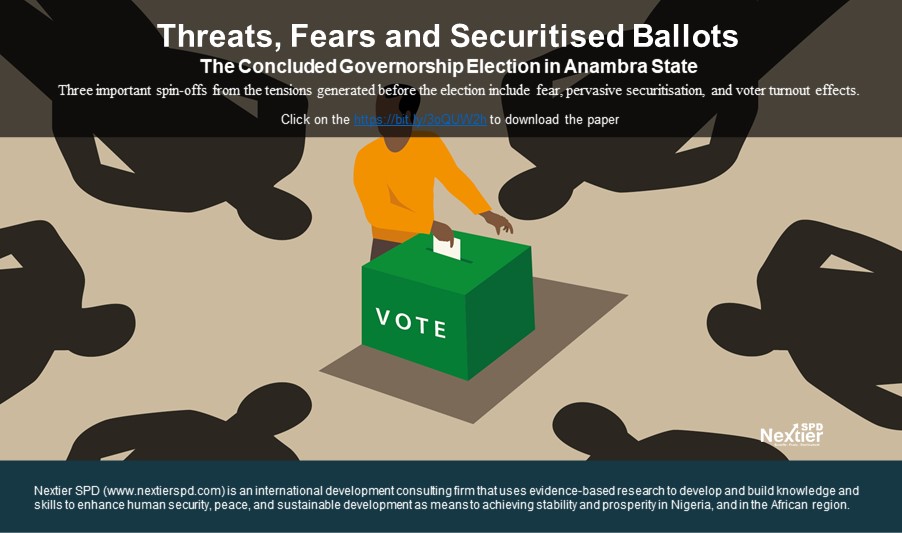 Policy Weekly Threats, Fears and Securitised Ballot: The Concluded Governorship Election in Anambra State by nextierspd November 18, 2021 written by nextierspd November 18, 2021 116 The governorship election for Anambra State took place on the 6th and 8th of November 2021. The ballot has come and gone and produced a winner and losers with the declaration of Prof Chukwuma Soludo of the All Progressives Grand Alliance (APGA) as the winner. The election arguably generated the highest level of anxiety and fear in Nigeria’s recent electoral history. The background to fears about the election is the fears and anxieties from the warning issued by a secessionist movement, the Independent People of Biafra (IPOB), that no election must hold in any part of the South-East. On the contrary, the Federal Government announced a determination to hold the governorship election. These counter declarations from two parties, both with the potentials to pursue their intentions with force, set the stage for brinkmanship between the State and the Biafran agitators. In a determined move to ensure that the election was held, the Federal government made a massive security deployment to create safety guarantees. However, the deployment became a source of greater anxiety as people feared potential clashes between IPOB and the government’s security personnel. In this edition of the Nextier SPD Policy Weekly, we reflect on the spin-offs of the fears of violent conflicts on the Anambra State 2021 governorship election. Click here to download report. 0 comment 0 FacebookTwitterPinterestEmail nextierspd previous post \’Bandits\’ Paradise\’ next post Long Walk to Forgiveness You may also like Youth Bulge, Governance and Security in Post-conflict Sierra... July 3, 2024 No Face, No Case: The Realities of Gender-sensitive... June 28, 2024 Strengthening Humanitarian Response in Post-Conflict Communities in Nigeria:... June 21, 2024 Crude Oil Theft and Illegal Refining in Nigeria:... June 13, 2024 Crude Oil Theft and Illegal Refining in Nigeria:... June 5, 2024 Navigating Autonomy in Nigeria’s LGAs: Challenges and Opportunities May 31, 2024 Rethinking Youth Engagement in Peacebuilding May 24, 2024 Strengthening Enablers of Peace and Security in the... May 17, 2024 Towards a Paradigm Shift in Conflict Management in... May 7, 2024 Redefining Slum Dwellers: Insights into Nigeria’s Urban Challenges... April 24, 2024 Leave a Comment Cancel Reply Save my name, email, and website in this browser for the next time I comment.