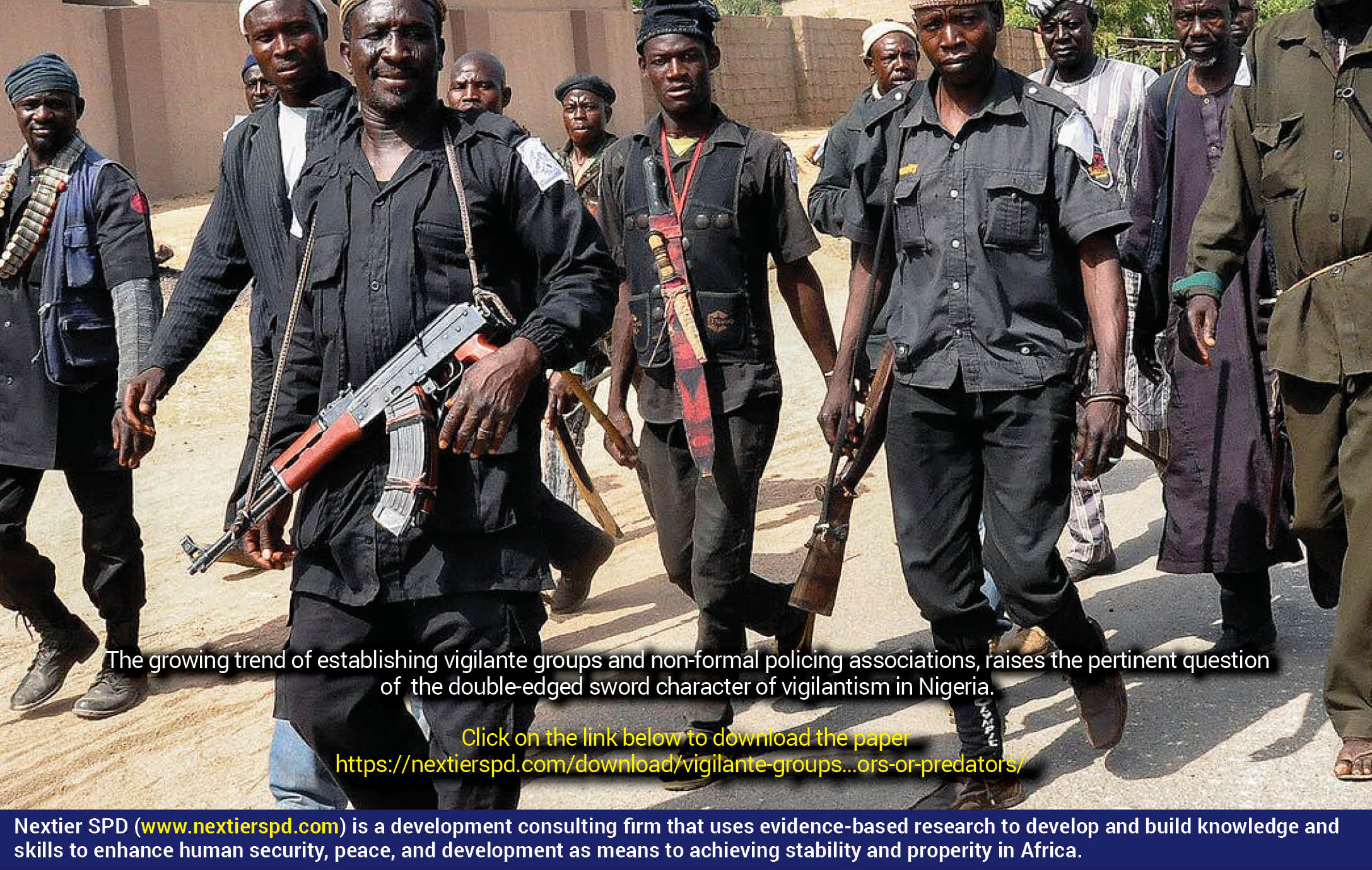 Policy Weekly Vigilante Groups: Protectors or Predators? by nextierspd January 20, 2020 written by nextierspd January 20, 2020 138 There is a growing trend by states and local communities to establish vigilante groups and non-formal policing organisations to complement the efforts of security agencies in crime detection and prevention in the state. Modern vigilantism in Nigeria had emerged in the context of political marginalisation and heightened criminality over two decades ago, with examples such as Oodua People’s Congress (OPC) and Bakassi Boys, Anambra Vigilante Group, Rivers State Neighbourhood Watch, Civilian Joint Task Force in the Northeast, etc. However, while some vigilante organisations operate within the ambit of the laws, others flout such laws and even perpetuate the crimes they are supposed to fight. Following this double-edged sword character of vigilantism in Nigeria, this edition of Nextier SPD Weekly examines the attractions of, and objections to, vigilante organisations as well as makes recommendations for better engagement of the civic militias. … Click here to download report. 0 comment 0 FacebookTwitterPinterestEmail nextierspd previous post C-JTF: Caging the Genie next post Strangers in their Homeland You may also like Youth Bulge, Governance and Security in Post-conflict Sierra... July 3, 2024 No Face, No Case: The Realities of Gender-sensitive... June 28, 2024 Strengthening Humanitarian Response in Post-Conflict Communities in Nigeria:... June 21, 2024 Crude Oil Theft and Illegal Refining in Nigeria:... June 13, 2024 Crude Oil Theft and Illegal Refining in Nigeria:... June 5, 2024 Navigating Autonomy in Nigeria’s LGAs: Challenges and Opportunities May 31, 2024 Rethinking Youth Engagement in Peacebuilding May 24, 2024 Strengthening Enablers of Peace and Security in the... May 17, 2024 Towards a Paradigm Shift in Conflict Management in... May 7, 2024 Redefining Slum Dwellers: Insights into Nigeria’s Urban Challenges... April 24, 2024 Leave a Comment Cancel Reply Save my name, email, and website in this browser for the next time I comment.