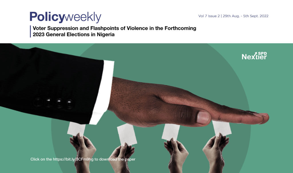 Policy Weekly Voter Suppression and Flashpoints of Violence in the Forthcoming 2023 General Elections in Nigeria by nextierspd August 29, 2022 written by nextierspd August 29, 2022 108 Voter suppression is a quiet but potent threat increasingly gaining momentum in Nigeria, especially as the 2023 general elections approach. With a combination of subtle and rough methods, voter-suppressive behaviours gradually erode progress under the elective civil rule. Operational challenges of the election management body, the Independent National Electoral Commission (INEC), especially the lack of adequate manpower and machines to register the teeming number of persons who want to enlist as voters, are one of the conditions that suppress the intention to register and vote. Secondly, there is a new trend in which violence is either threatened or unleashed on voter registration centres to drive away intending registrants, as recently reported in parts of Lagos State and Abuja. Thirdly, massive quantities of manufactured Permanent Voters Cards (PVCs) have been discovered where they were deliberately buried away or discarded with an obvious intention to prevent them from being used for voting. In this edition of Nextier Policy Weekly, we look at how these developments suppress voters and create areas of security concern with a view to drawing policy attention to them and providing options for meaningfully preventing them from undermining the forthcoming presidential election. Click here to download report 0 comment 0 FacebookTwitterPinterestEmail nextierspd previous post The Launch of Nigeria’s Energy Transition Plan next post Snitches and Victims You may also like Youth Bulge, Governance and Security in Post-conflict Sierra... July 3, 2024 No Face, No Case: The Realities of Gender-sensitive... June 28, 2024 Strengthening Humanitarian Response in Post-Conflict Communities in Nigeria:... June 21, 2024 Crude Oil Theft and Illegal Refining in Nigeria:... June 13, 2024 Crude Oil Theft and Illegal Refining in Nigeria:... June 5, 2024 Navigating Autonomy in Nigeria’s LGAs: Challenges and Opportunities May 31, 2024 Rethinking Youth Engagement in Peacebuilding May 24, 2024 Strengthening Enablers of Peace and Security in the... May 17, 2024 Towards a Paradigm Shift in Conflict Management in... May 7, 2024 Redefining Slum Dwellers: Insights into Nigeria’s Urban Challenges... April 24, 2024
