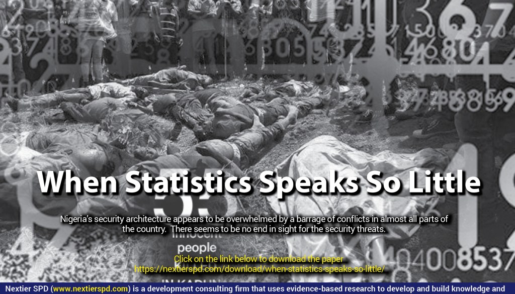 Policy Weekly When Statistics Speaks So Little by nextierspd January 20, 2020 written by nextierspd January 20, 2020 138 2018 was a violent year in Nigeria. There were hundreds of deaths resulting from various conflicts including farmer-herder clashes, Boko Haram terrorism, the ethnic crisis in Plateau state, the religious crisis in Kaduna state, killings of Shiite protesters in Abuja, rural banditry in North-West Nigeria, violent armed robbery across the country, kidnappings, state violence, and even from natural disasters. Nigeria’s security architecture appears to be overwhelmed by a barrage of conflicts in almost all parts of the country. There seems to be no end in sight for the security threats. This edition of Nextier SPD Weekly examines the challenges with the statistical representations of violent killings in Nigeria and what it fails to cover. This essay presents recommendations on how to use such data to prevent future occurrence. … Click here to download report. 0 comment 0 FacebookTwitterPinterestEmail nextierspd previous post Politics and the Thugs of War next post Voyage of Life or Death You may also like Youth Bulge, Governance and Security in Post-conflict Sierra... July 3, 2024 No Face, No Case: The Realities of Gender-sensitive... June 28, 2024 Strengthening Humanitarian Response in Post-Conflict Communities in Nigeria:... June 21, 2024 Crude Oil Theft and Illegal Refining in Nigeria:... June 13, 2024 Crude Oil Theft and Illegal Refining in Nigeria:... June 5, 2024 Navigating Autonomy in Nigeria’s LGAs: Challenges and Opportunities May 31, 2024 Rethinking Youth Engagement in Peacebuilding May 24, 2024 Strengthening Enablers of Peace and Security in the... May 17, 2024 Towards a Paradigm Shift in Conflict Management in... May 7, 2024 Redefining Slum Dwellers: Insights into Nigeria’s Urban Challenges... April 24, 2024 Leave a Comment Cancel Reply Save my name, email, and website in this browser for the next time I comment.